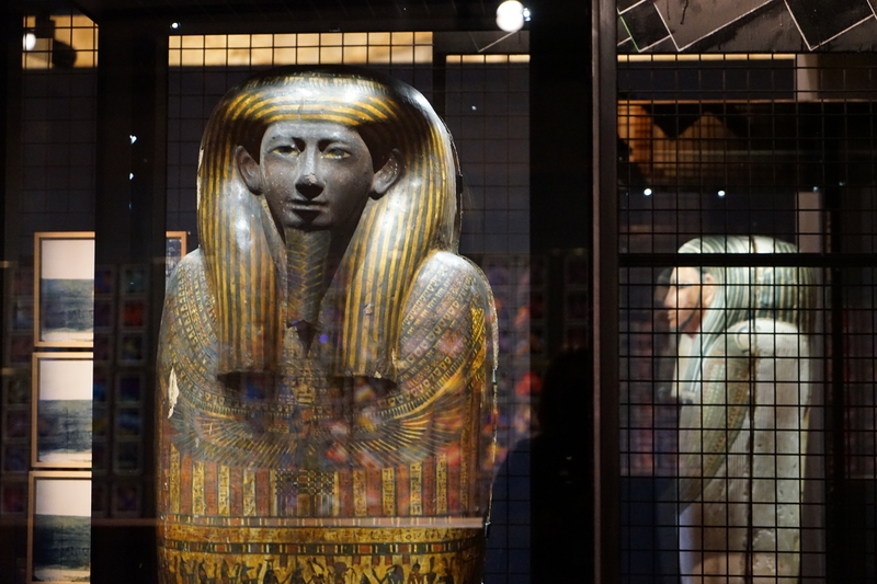 Das MONA liegt unter der Erde und die Besucher fahren mit einem Fahrstuhl hinunter. Und landen erst einmal in einer Bar. Ein Drink, so David Walsh, könne nicht schaden, bevor der Besuch beginnt. Im MONA ist es dunkel und seine verschlungenen Treppen und Korridore erinnern an ein Labyrinth, in dem sich der Besucher verläuft. Wie aus dem Nichts tauchen in der Dunkelheit moderne Kunstobjekte von Erwin Wurm oder Wim Delvoye auf. Gleich daneben stehen ägyptische Sarkophage und eine holzgeschnitzte Palasttür aus Nigeria. Alle Epochen vermischen sich und stehen gleichberechtigt nebeneinander.